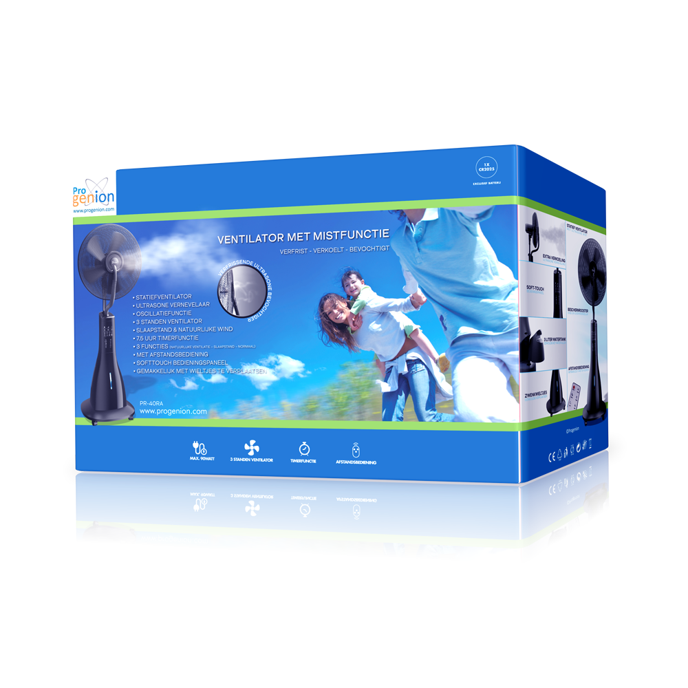 De Progenion PR-40RA is uw perfecte metgezel tijdens de hete zomerdagen. Deze hoogwaardige ventilator heeft drie snelheidsinstellingen en een afzonderlijk inschakelbare nevelfunctie die zorgt voor een aangename verkoeling. De ventilator biedt ook diverse andere functies, waaronder een draaifunctie, timer, slaapmodus en een functie voor natuurlijke wind. Dankzij de krachtige 100% koperen motor en de driebladige ventilator werkt dit apparaat uiterst stil en heeft het een lange levensduur. Met de vier soepel rollende zwenkwielen verplaatst u de ventilator eenvoudig naar elke gewenste ruimte. Bovendien kunt u alle functies gemakkelijk bedienen met de meegeleverde afstandsbediening vanaf een afstand tot wel 5 meter.