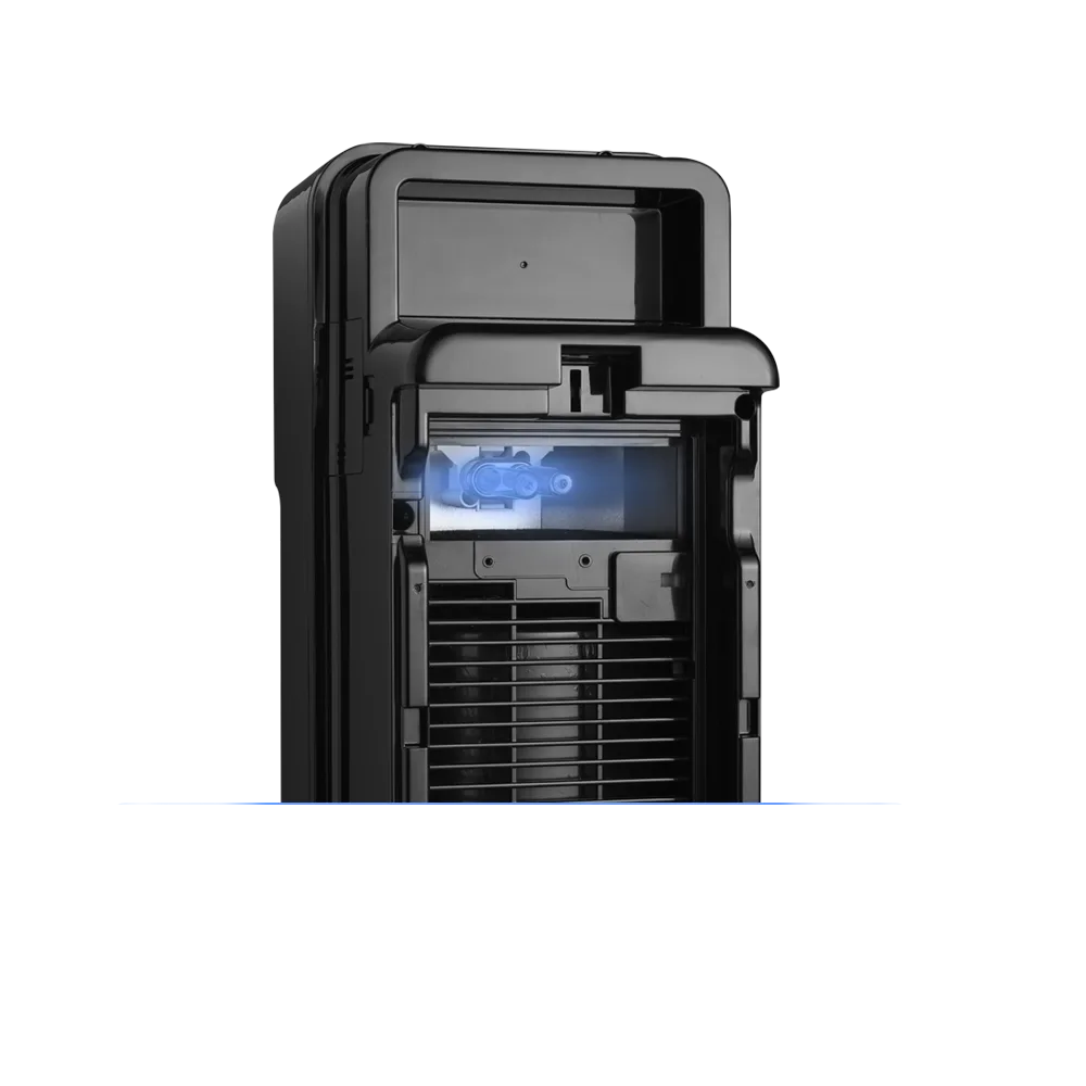 Daarna volgt het actief koolstoffilter met koolstofkorrels, dat effectief hinderlijke geuren, rooklucht, vluchtige organische stoffen (VOC’s) en schadelijke gassen uit de binnenlucht absorbeert. In de daaropvolgende stap wordt de lucht blootgesteld aan krachtige straling van de UV-C lamp, die micro-organismen zoals virussen, bacteriën en schimmels onschadelijk maakt door hun DNA-structuren te vernietigen.